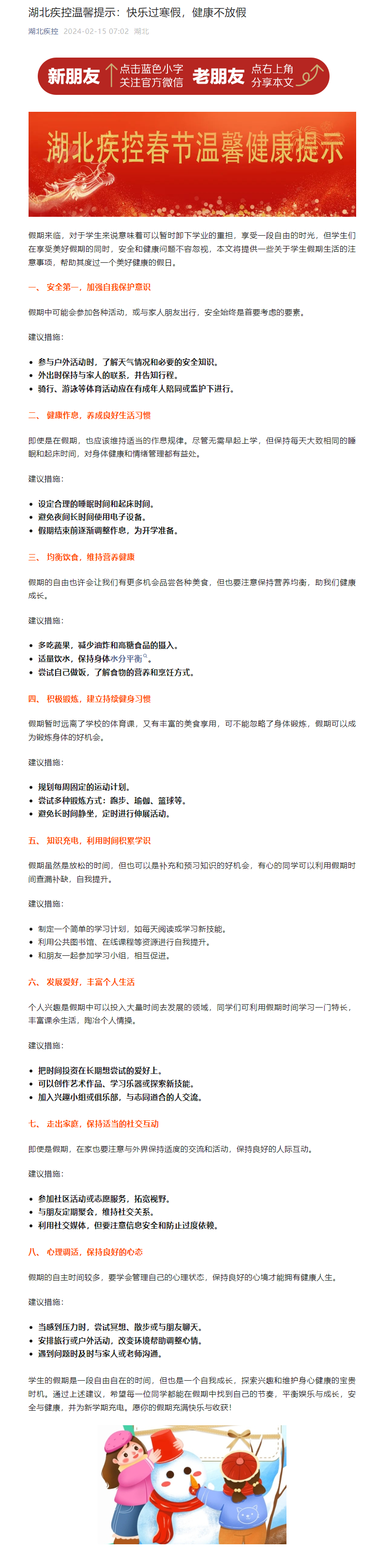湖北疾控溫馨提示:快樂過寒假,健康不放假