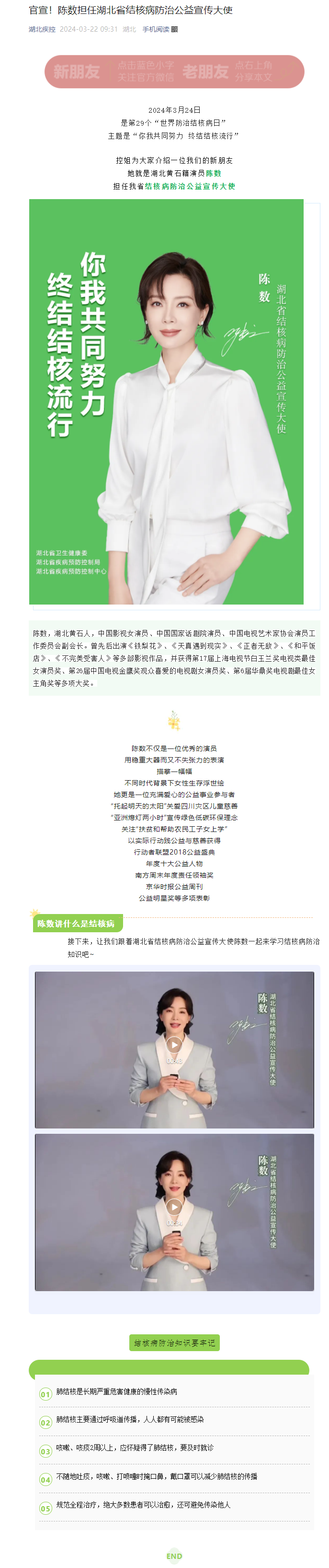 官宣!陳數(shù)擔(dān)任湖北省結(jié)核病防治公益宣傳大使