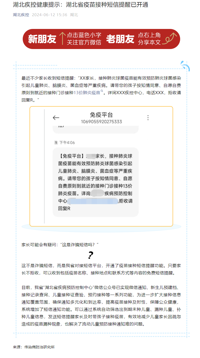 湖北疾控健康提示:湖北省疫苗接種短信提醒已開(kāi)通