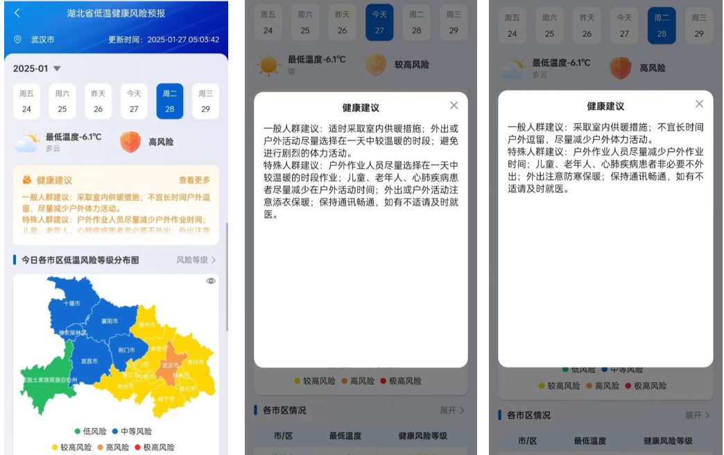 湖北省低溫寒潮健康風(fēng)險預(yù)報為湖北省環(huán)境健康風(fēng)險預(yù)報發(fā)布平臺三大功能之一,可展示我省當日及未來2日的最低溫度,提示對應(yīng)的低溫健康風(fēng)險等級和健康防護建議,其信息展示在空間尺度上可精確至17個地市州的每個區(qū)縣。對于不同的天氣情況,低溫健康風(fēng)險等級共分為“低風(fēng)險、中等風(fēng)險、較高風(fēng)險、高風(fēng)險、極高風(fēng)險”5個等級,每個等級所匹配的健康防護建議可以幫助公眾提前做好應(yīng)對和健康防護,達到降低健康損失的目的。該平臺自2024年12月17日正式上線以來,已連續(xù)發(fā)布低溫健康風(fēng)險信息40余天,并將持續(xù)發(fā)布。