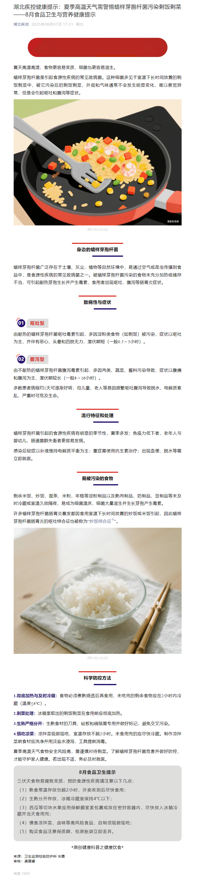 湖北疾控健康提示:夏季高溫天氣需警惕蠟樣芽胞桿菌污染剩飯剩菜——8月食品衛(wèi)生與營(yíng)養(yǎng)健康提示