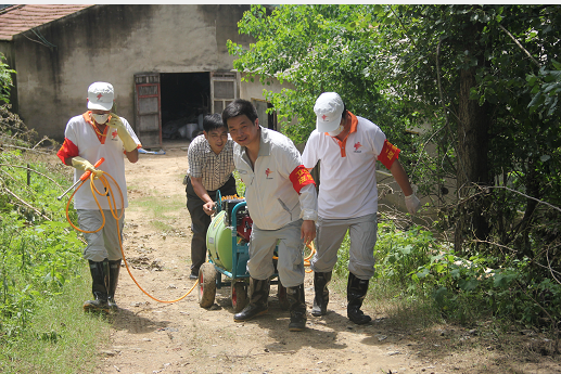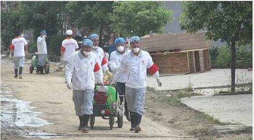 中心副主任徐勝平和梁智輝,2008年曾代表麻城疾控人參加了四川汶川大地震的救災(zāi)防疫工作,為災(zāi)區(qū)人民的健康作出他們應(yīng)有的貢獻(xiàn)。在麻城這場(chǎng)沒(méi)有硝煙的戰(zhàn)斗中,他們又擔(dān)起了重任,作為應(yīng)急分隊(duì)的主干成員,每天輾轉(zhuǎn)于各個(gè)災(zāi)區(qū)處置現(xiàn)場(chǎng),指導(dǎo)和參與消殺及疾病監(jiān)測(cè)等具體工作。7月6日由他們帶領(lǐng)的衛(wèi)生應(yīng)急二分隊(duì)前往宋家河村養(yǎng)殖廠。還未靠近養(yǎng)殖廠,一陣陣惡臭撲鼻而來(lái),現(xiàn)場(chǎng)更是一片狼藉,隨處可見(jiàn)的人畜糞便、生活垃圾,污水四溢,蒼蠅蚊子滿(mǎn)天飛….盡管環(huán)境如此惡劣,他們絲毫沒(méi)有猶豫,沒(méi)有退縮,迅速明確分工,由董少波主任負(fù)責(zé)藥水的配制工作,其余同志密切配合按區(qū)域分片開(kāi)展現(xiàn)場(chǎng)消殺。村里沒(méi)有自來(lái)水,他們就推著笨重的消殺車(chē)、背著沉沉的噴霧器來(lái)到河邊用水桶取水完成消毒劑配制工作,然后各行其責(zé)對(duì)廠區(qū)及附近的水井、廁所、房前屋后、垃圾堆等區(qū)域進(jìn)行拉網(wǎng)式噴灑清毒,不放過(guò)任何一個(gè)衛(wèi)生死角,堅(jiān)決把細(xì)菌病毒消滅掉。烈日當(dāng)頭,空氣中彌散著濃濃的消毒劑熏得人睜不開(kāi)眼,刺得喉嚨如火燒一般,氣味令人作嘔,但隊(duì)員們沒(méi)有一個(gè)人叫苦叫累,更沒(méi)有人想過(guò)要退出。由于連續(xù)作戰(zhàn),董少波和蔡利平兩位同志出現(xiàn)嚴(yán)重的頭暈、胸悶、面色蒼白、出汗等中暑癥狀,可經(jīng)過(guò)短暫的休息調(diào)整后他們轉(zhuǎn)身投入到消殺戰(zhàn)斗中。