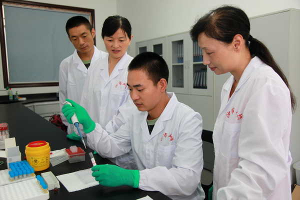 圖為武警衛(wèi)生員正在老師的指導(dǎo)下進行血吸蟲病血清學(xué)檢測。