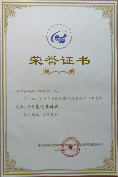 2004-2019年死因監(jiān)測工作獲國家疾控中心表彰