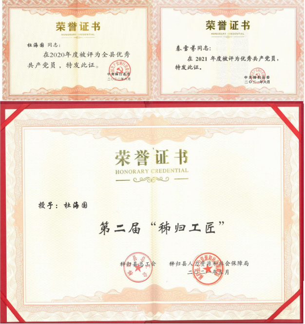杜海國、秦雪芬被評為優(yōu)秀共產(chǎn)黨員、秭歸工匠