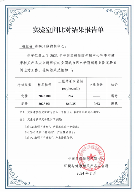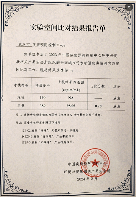 為提高污水新冠病毒監(jiān)測數(shù)據(jù)的準(zhǔn)確性和可靠性,受國家疾病預(yù)防控制局委托,中國疾病預(yù)防控制中心環(huán)境與健康相關(guān)產(chǎn)品安全所于2023年底組織開展了城市污水新冠病毒監(jiān)測實驗室間比對工作。本中心和武漢市疾病預(yù)防控制中心、宜昌市疾病預(yù)防控制中心按要求參加了此次實驗室間比對工作。