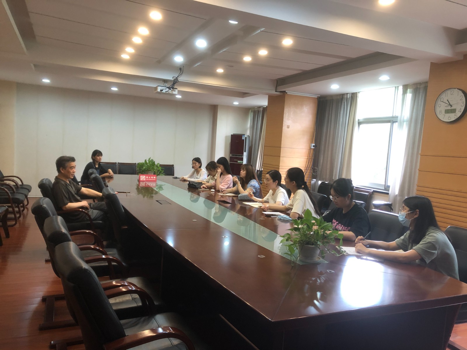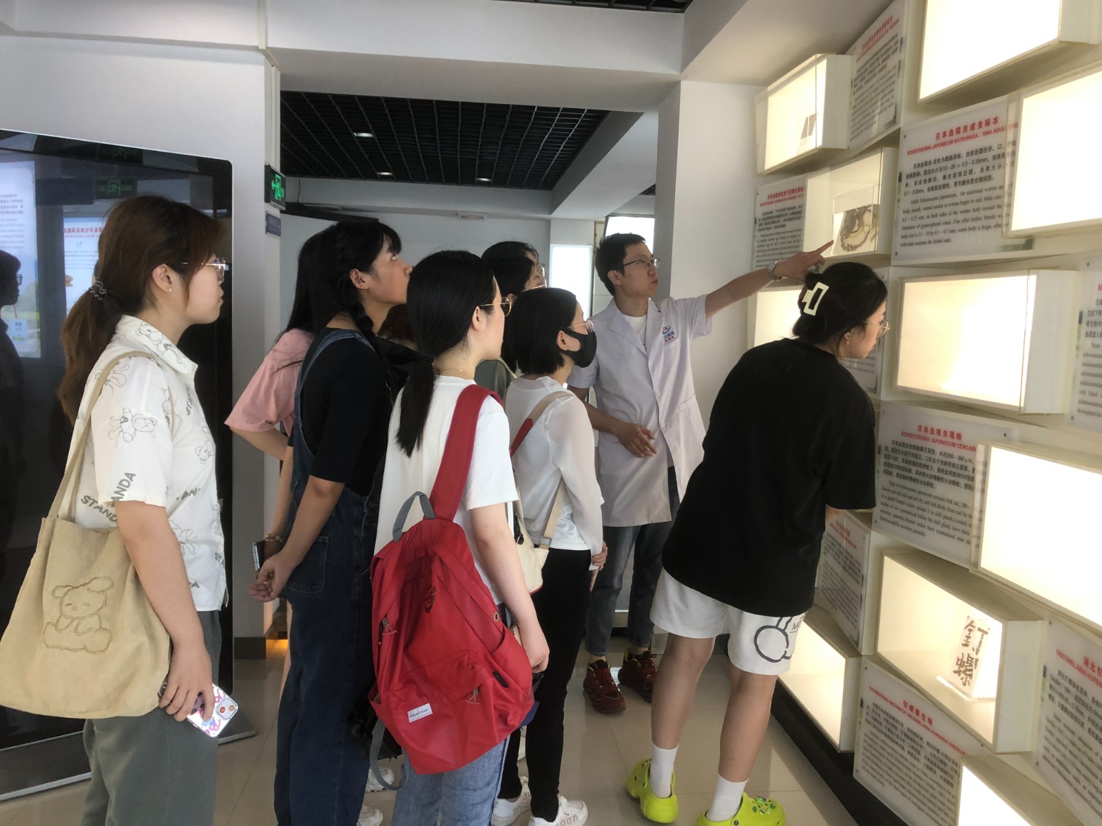 活動采用參觀學習、座談交流的方式。首先,由血防所病原室負責人李博主管技師帶領(lǐng)大家參觀學習了中心(院)醫(yī)學生物標本館,依次從吸蟲、絳蟲、線蟲、原蟲、動物宿主、媒介節(jié)肢動物等8個展區(qū)進行了詳細講解。大學生們通過實物標本與文字圖片的學習,了解了湖北省血吸蟲病的防治歷史和當前疫情現(xiàn)狀,以及其它寄生蟲病的危害與防控措施。隨后,血防所劉斯所長等與大學生們進行了深入與親切的交流,涉及省血防所的具體工作職責,我省血防防控現(xiàn)狀、監(jiān)測措施、健康教育、科學研究等方面的內(nèi)容。